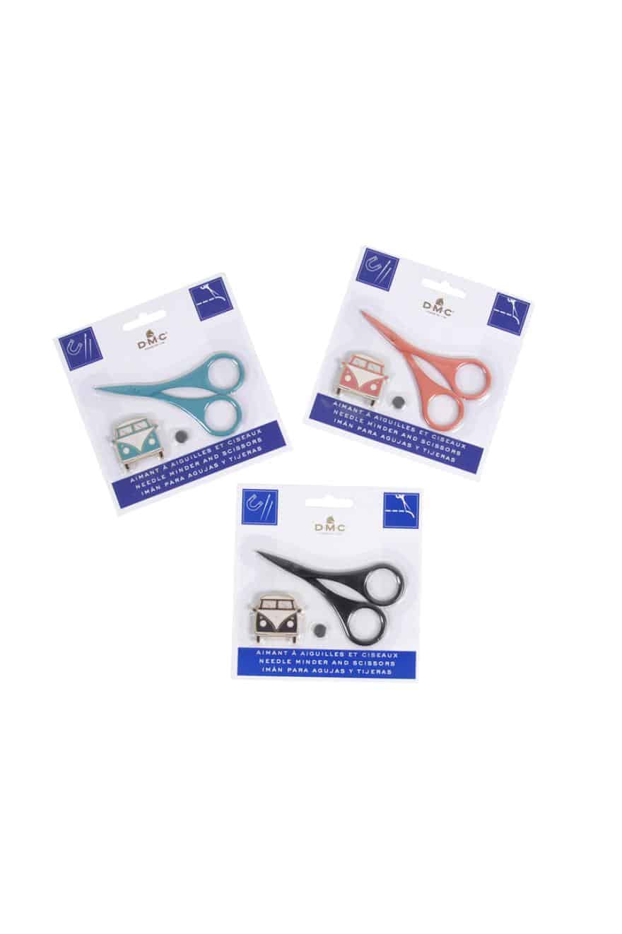 Ciseaux entièrement colorés avec lame droite et lisse, parfaits pour découper fils et tissus. Et un puissant aimant en forme de van pour maintenir les aiguilles en place en toute sécurité.