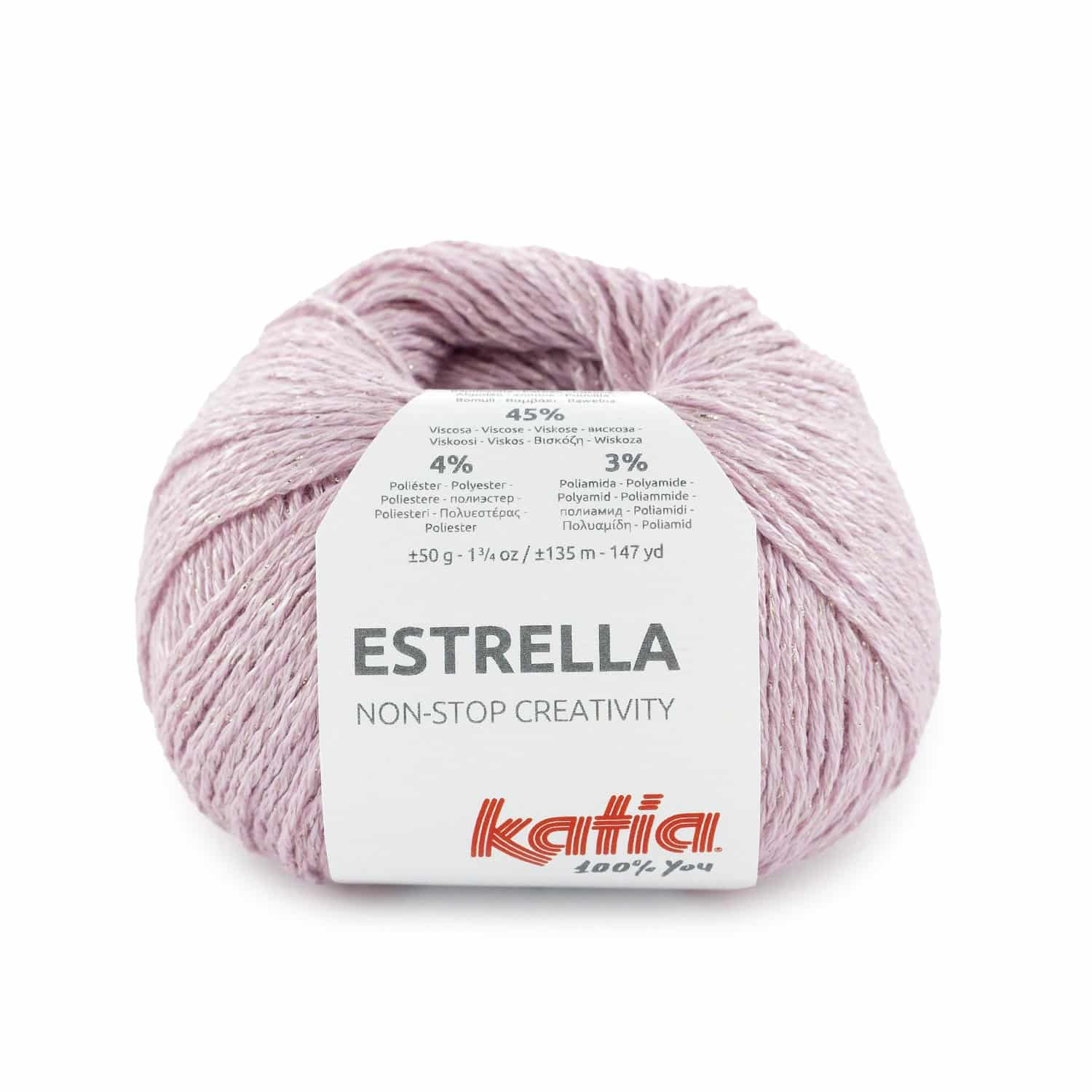 Brillez avec style grâce à Katia Estrella, un fil fantaisie avec un aspect mat-brillant et au toucher soyeux, parfait pour des vêtements d’été élégants et chic. Son mélange doux et léger de coton et viscose est idéal pour tous vos tricots et vos ouvrages au crochet. Créez des pièces uniques pour vos looks faits main d’été avec Katia Estrella.48% Coton – 45% viscose – 4% Polyester – 3% Polyamide