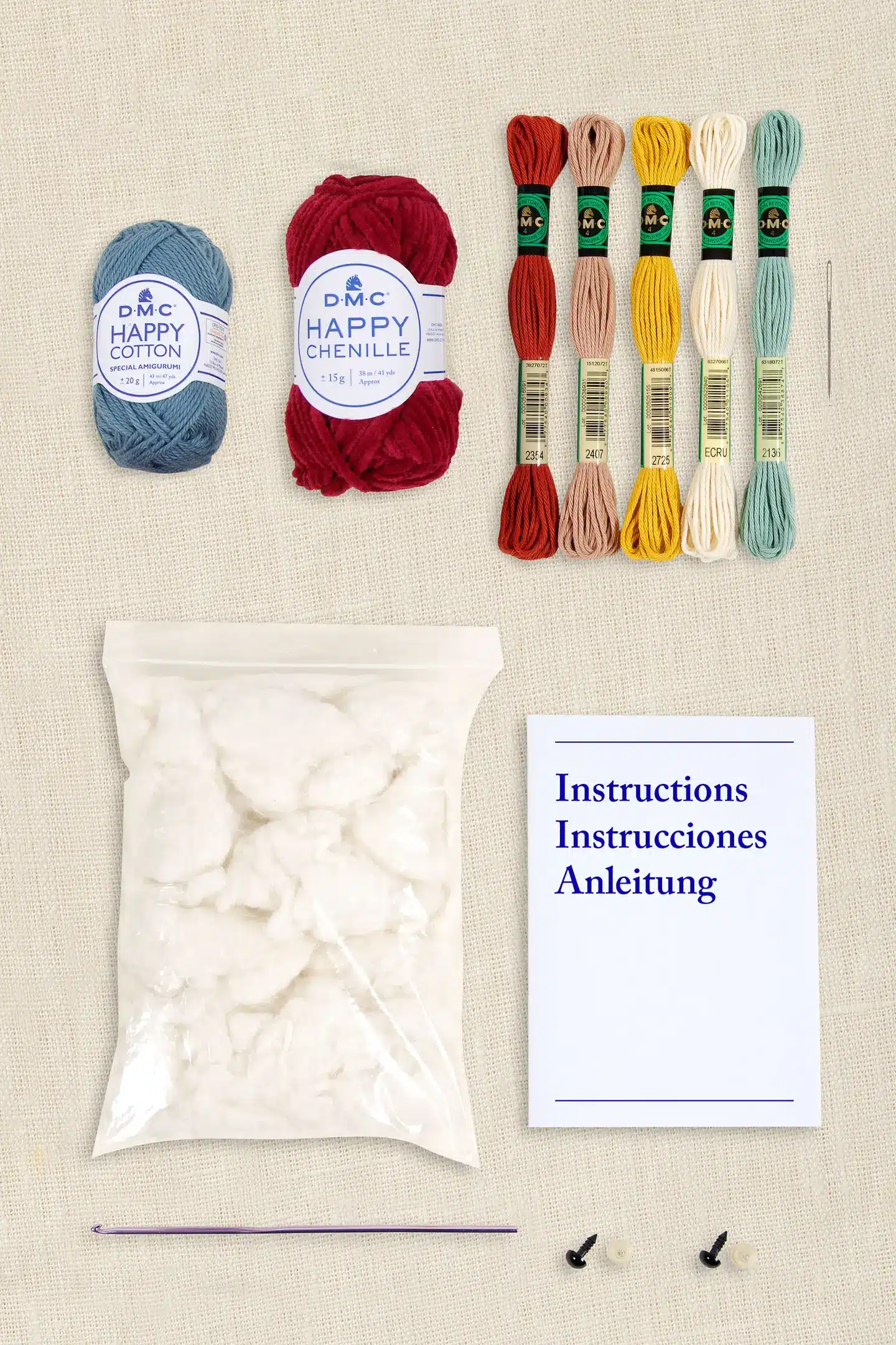 Ce kit contient tout le nécessaire pour réaliser ce modèle : une pelote de 20 gr de Happy Cotton, une pelote de 15 gr de fil Happy Chenille, cinq échevettes de fil Coton, un crochet de 3 mm, une aiguille, un sachet de rembourrage de 30 gr et une paire d’yeux de sécurité.