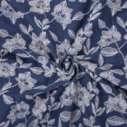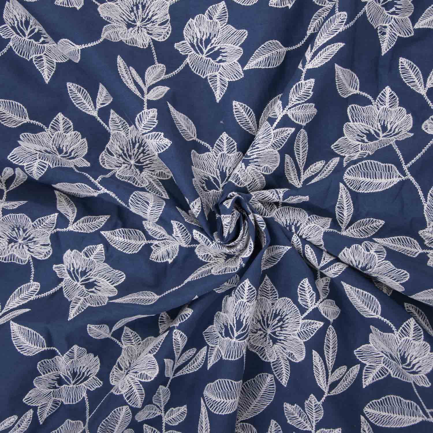 Ajoutez une touche handmade actuelle à vos vêtements avec Embroidery Jeans & White, un tissu en voile brodé dans les tons bleu denim avec des motifs floraux blancs.